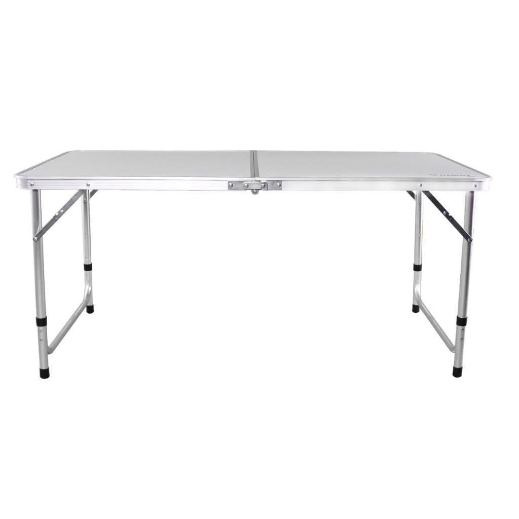 Kurulumu ve toplaması kolay, son derece sağlam ve son derece hafif, katlanır tablalı ve yüksekliği ayrı ayrı ayarlanabilen ayaklara sahip hafif alüminyum katlanır kamp masası.