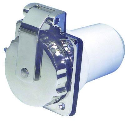 220V priz. AISI 316 paslanmaz çelik, kolayca açılıp kapanan su geçirmez kapaklı. Kontaklar nikel kaplıdır. Arka kablo koruması polikarbonattır.