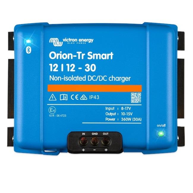 Orion-Tr Akıllı DC-DC şarj aleti, 3 aşamalı ve Bluetooth özellikli profesyonel bir DC-DC şarj cihazıdır. Servis akülerinin alternatör ve marş aküsüyle şarj edildiği taşıtlardaki veya su taşıtlarındaki çift batarya sistemleri için tasarlandı. Ünite Bluetooth üzerinden izlenebilir ve programlanabilir, bir açma/kapama anahtarıyla uzaktan kontrol edilebilir. Orion-Tr Smart şarj cihazı 12 V ve 24 V sistemlerde kullanılabilir. Hem kurşun asit, hem de lityum bataryalara uygundur. 400 W değerine kadar modeller mevcuttur, çıkış gücünü artırmak için sınırsız sayıda birim paralel bağlanabilir. Tam çıkış gücünü 40°C sıcaklığa kadar korumakla birlikte, ürün 55°C sıcaklığa kadar kullanılabilir.